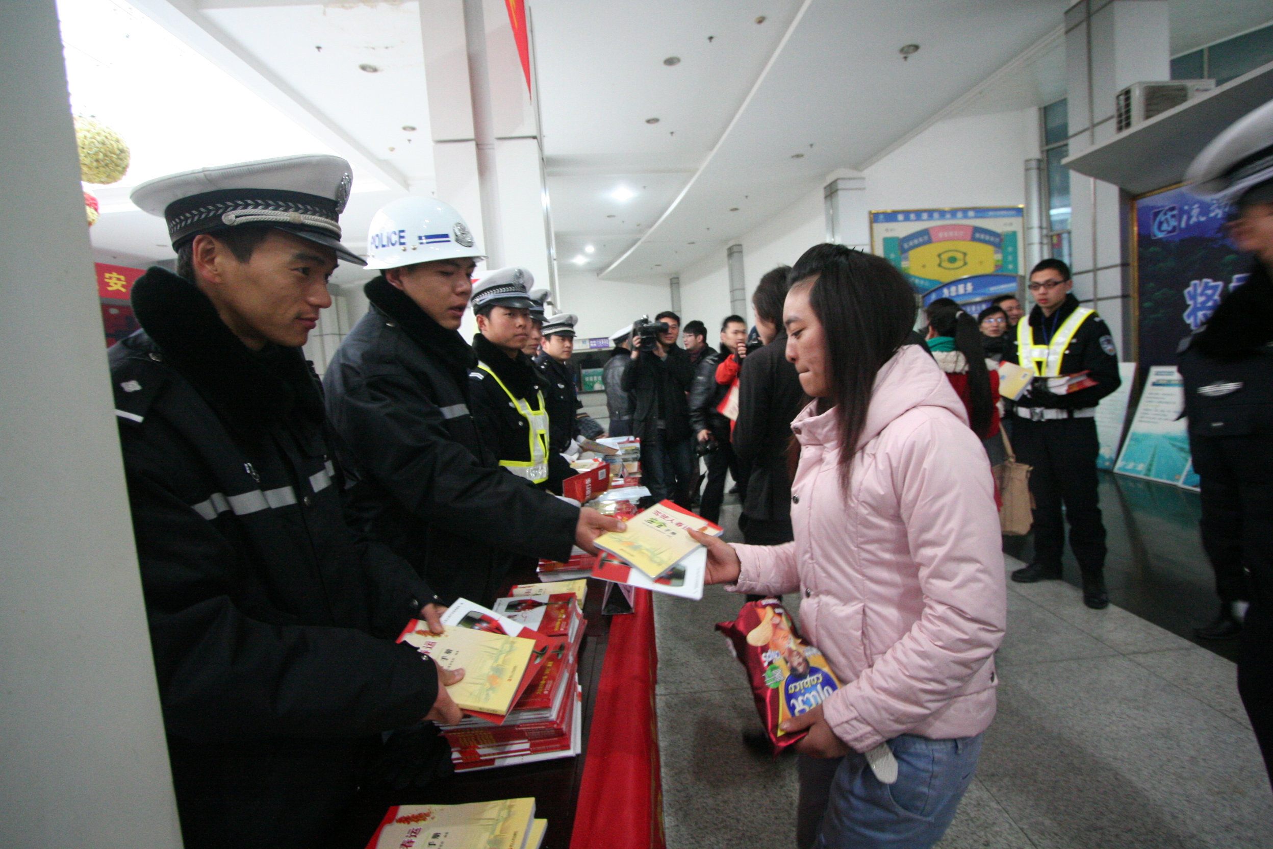 春運(yùn)首日,麗水市交警支隊(duì)、高速交警麗水支隊(duì)、麗水市運(yùn)管處、麗水交通音樂頻率四家單位聯(lián)合客運(yùn)東、西站在兩站候車廳開展春運(yùn)首日暨平安春運(yùn)問計(jì)于民宣傳咨詢活動(dòng)?;顒?dòng)現(xiàn)場(chǎng),設(shè)立了交通安全宣傳窗,高速交警進(jìn)行了調(diào)查問卷活動(dòng)。四家單位除了通過派送春節(jié)禮包、新年掛歷、福字等形式送上新年祝福同時(shí),還向旅客發(fā)放了《駕駛?cè)舜哼\(yùn)安全手冊(cè)》、《珍愛生命 拒絕酒駕》、《平安出行 快樂駕車》、《新手上路必讀》等宣傳圖冊(cè),向大家倡導(dǎo)“平安春運(yùn),人人有責(zé)”的理念。