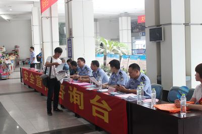 活動現(xiàn)場懸掛了安全生產宣傳標語,設置了安全咨詢臺,并在候車室前廳、中廳等人員聚集的位置,放置了各類以安全為主題的宣傳版畫,圖文并茂的向旅客宣傳了防詐騙、交通、防恐等安全知識。在整個活動期間,到咨詢臺來現(xiàn)場咨詢的旅客絡繹不絕,各單位咨詢人員還向旅客發(fā)放了《平安交通 人人有責》、《警民相約 共建和諧》、《公民防范恐怖襲擊手冊》、《為防范與遏制“電信(網(wǎng)絡)詐騙犯罪”致市民的一封信》等十余種安全生產宣傳資料共計2000余份,營造了安全生產月活動的良好氛圍。