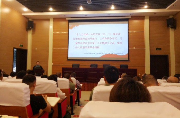 市委黨史研究室、市地方志辦公室主任雷華英從浙西南革命精神的歷史概況、內(nèi)涵和解讀、弘揚(yáng)踐行浙西南革命精神三個(gè)方面授課。在革命戰(zhàn)爭年代,老一輩革命家在麗水所有的縣市區(qū)都留下了光輝戰(zhàn)斗足跡,締造了偉大的“浙西南革命精神”。周恩來同志在麗水的抗戰(zhàn)史;粟裕、劉英同志帶領(lǐng)中國工農(nóng)紅軍挺進(jìn)師,與麗水人民一道浴血奮戰(zhàn),團(tuán)結(jié)一心干革命,播撒了開啟光明的寶貴革命火種。直至如今,偉大精神已深深融入麗水大地,流淌在處州兒女的血脈中,成為激勵(lì)一代又一代麗水人堅(jiān)定理想信念、戰(zhàn)勝一切困難、奪取前進(jìn)道路上一個(gè)又一個(gè)勝利的力量源泉。