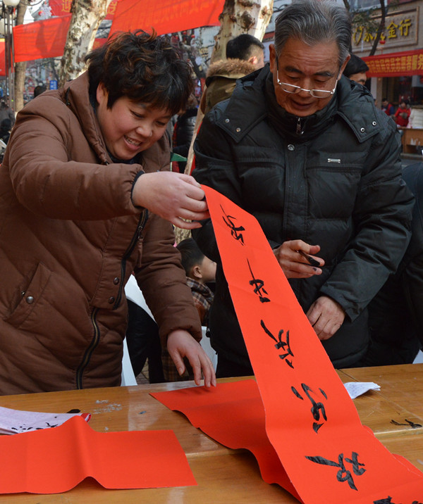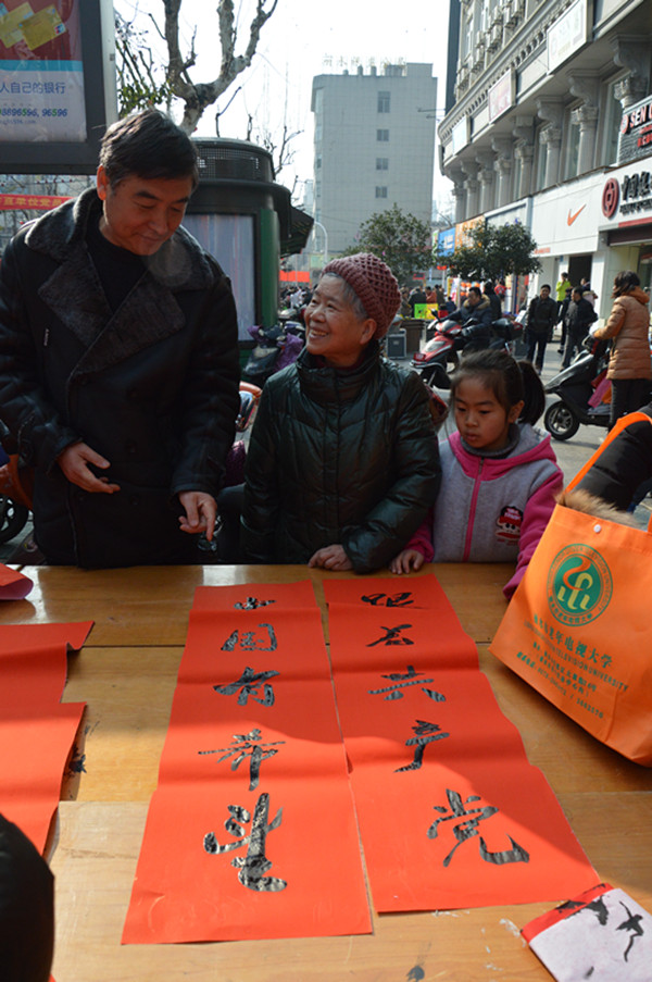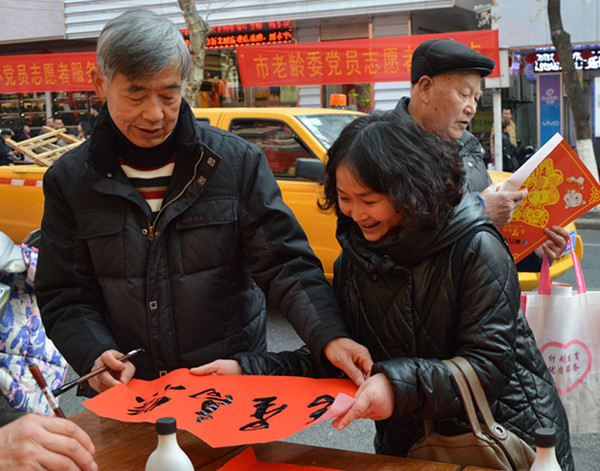 幾張小桌子拼成的簡(jiǎn)易書(shū)案更是黨員一條街上靚麗的風(fēng)景。三位老同志一落筆,書(shū)案旁邊一下子就圍滿了人,大家一邊排隊(duì)等候著“墨寶”,一邊點(diǎn)贊著三位老師的書(shū)法。葉女士高興地說(shuō):“手寫(xiě)的春聯(lián)不僅更有年味,而且還是在弘揚(yáng)中國(guó)的書(shū)法藝術(shù)。中國(guó)傳統(tǒng)的年俗文化,現(xiàn)在已經(jīng)越來(lái)越難得了?!币粚?duì)雙胞胎寶寶的父母恰巧推著嬰兒車(chē)從服務(wù)點(diǎn)前經(jīng)過(guò),趕緊請(qǐng)老師寫(xiě)下“開(kāi)心寶貝”四個(gè)字,還說(shuō)是給孩子倆最珍貴的新年禮物。