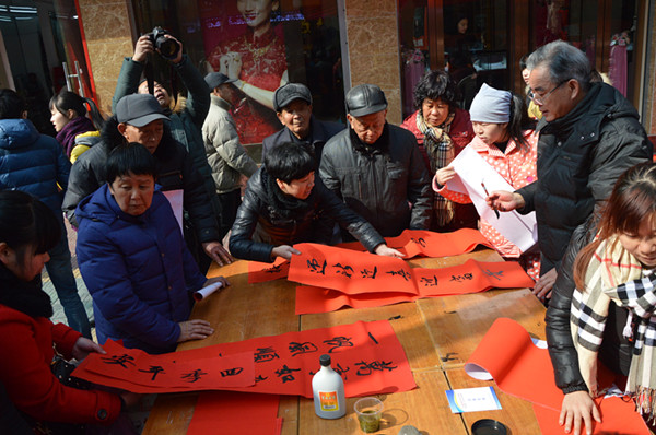 雖然時(shí)節(jié)已過(guò)立春,但農(nóng)歷臘月十九(2月7日)的早上還是寒意逼人,麗汽集團(tuán)的黨員們卻一早就來(lái)到中山街路段,面向廣大群眾展開(kāi)了春節(jié)班車(chē)時(shí)刻咨詢、汽車(chē)銷(xiāo)售維修服務(wù)和送春聯(lián)、送福字三項(xiàng)服務(wù)。退休老黨員蘭延生、陳根松、王法根三人更是現(xiàn)場(chǎng)潑墨揮毫,冒著嚴(yán)寒為現(xiàn)場(chǎng)的群眾書(shū)寫(xiě)春聯(lián),送去新春祝福。短短半天時(shí)間里,黨員們共發(fā)放春運(yùn)班車(chē)時(shí)刻表、汽車(chē)銷(xiāo)售維修資料500份,解答咨詢76人次,贈(zèng)送福字1800張,為群眾現(xiàn)場(chǎng)書(shū)寫(xiě)春聯(lián)450幅,惠及群眾1500人次。